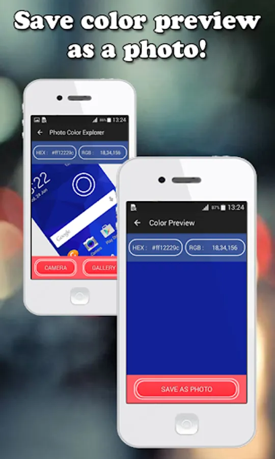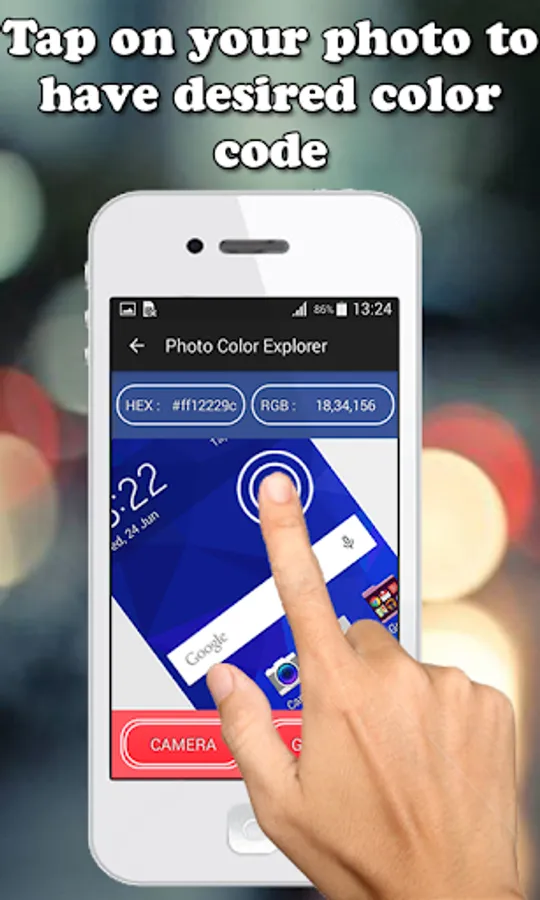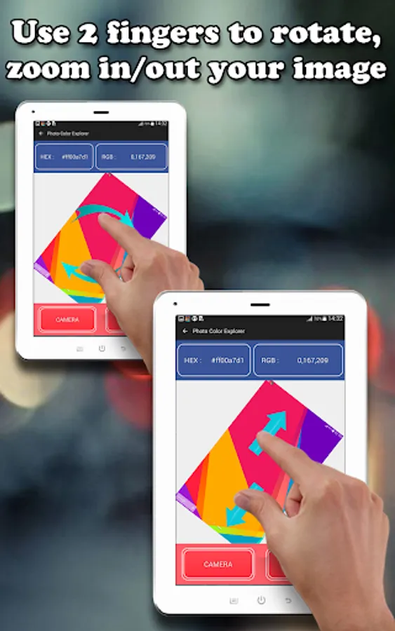 An ultimate color picker tool which lets you load an image taken from Gallery or Camera, rotate, zoom in/out and get the HEX & RGB values just by tapping on your photo.