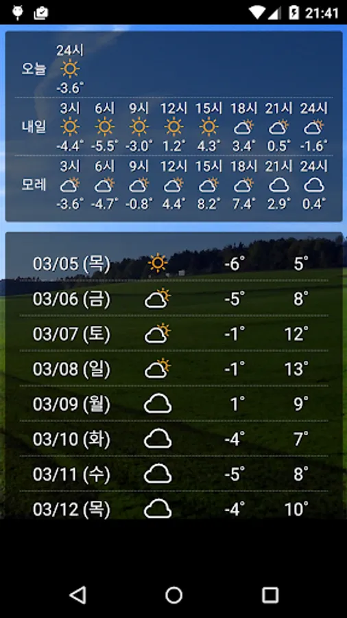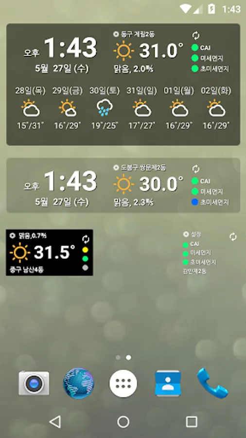 Weather and dust is an app that allows you to view your current location or the weather forecast of the Korea Meteorological Agency for a designated area, and air pollution information of the Korea Environment Corporation (Air Korea) at once.