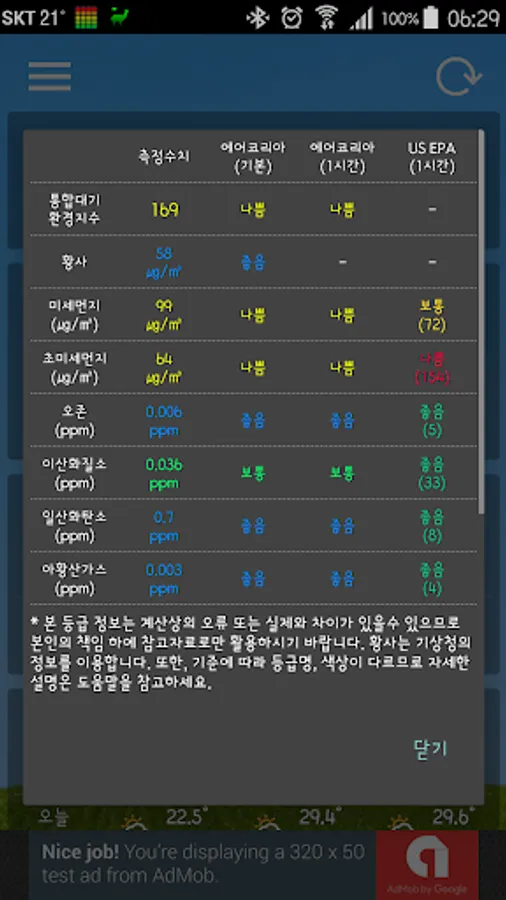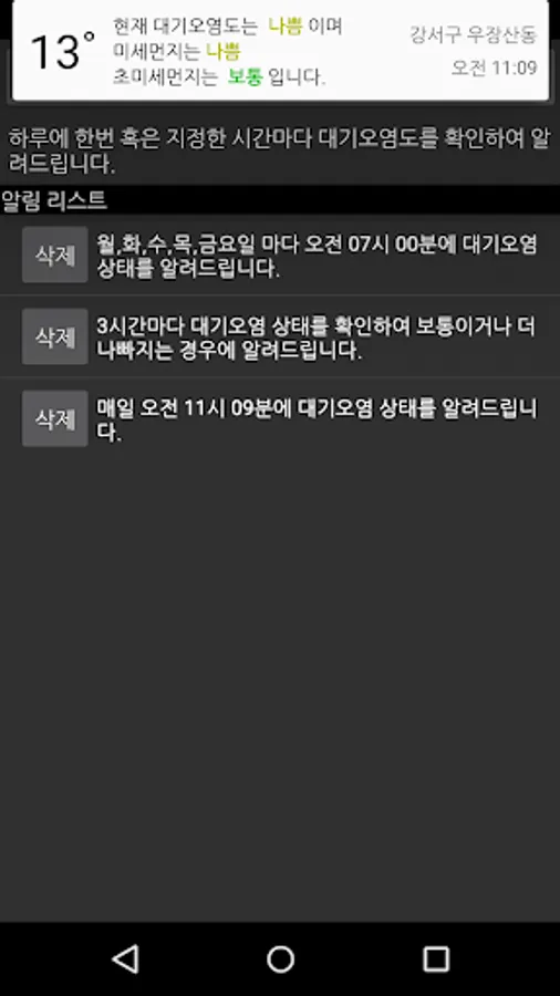 - Periodically check the air pollution level, fine dust, and ultra-fine dust grade and notify you if the grade is set or worse. (The air pollution level used is Air Korea-Basic.)