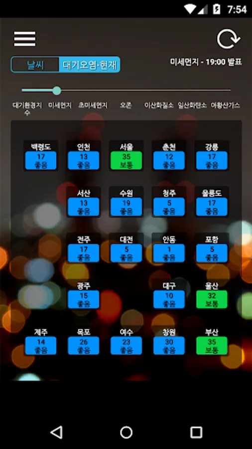 - Displays air pollution information (fine dust (yellow dust)-PM10, ultra-fine dust-PM2.5, integrated air quality index-CAI, etc.) of the current location or the nearest measuring station to the set area.