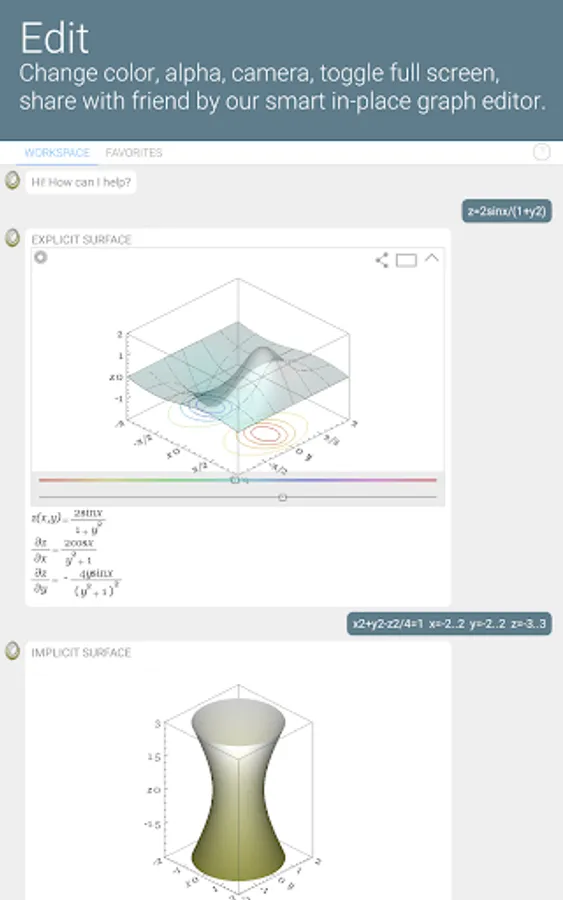 Newton Graphing Calculator graph 2D curve and 3D surface by math input like handwriting. With our innovative parser, math syntax is as simple as when you write it on your note. 2D or 3D graph is recognized automatically by number of unknown variables, through our powerful symbolic math engine. After graphing, you can find function roots, track coordinates, pan or zoom 2D graph; draw contour, zoom or rotate 3D graph to view from all angles seamlessly by hand gesture, to study mathematical property of the function.
