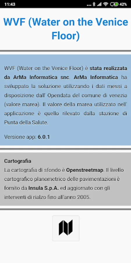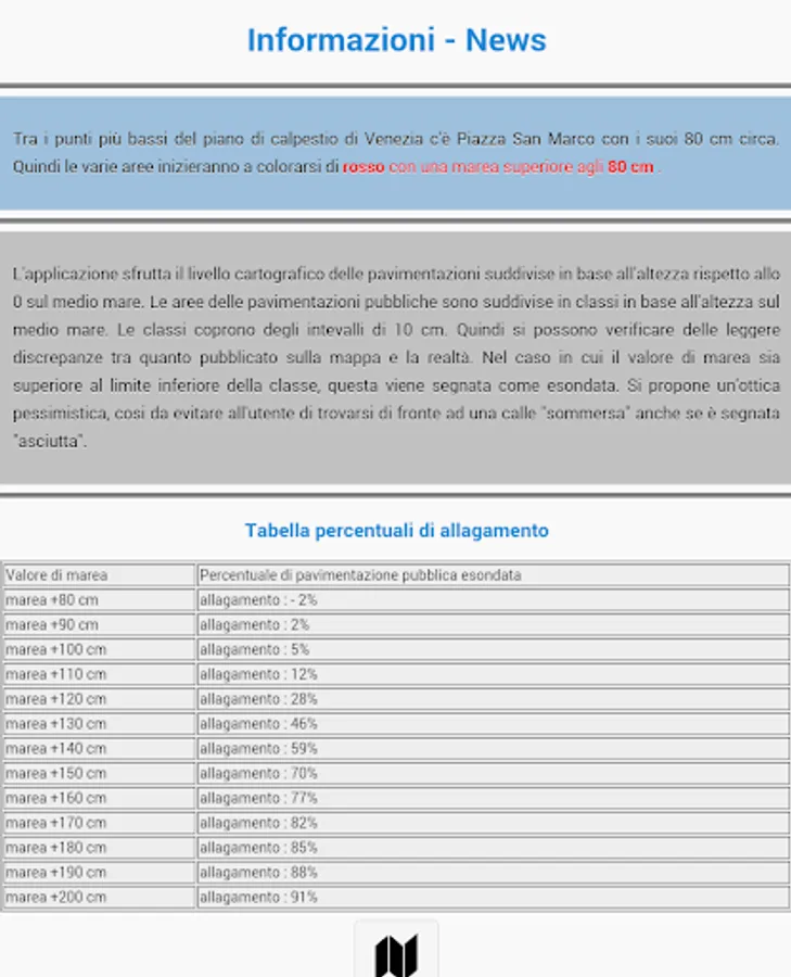 The application is the ideal tool used to avoid being stopped in front of a flooded Calle and to arrive at your destination dry. WVF is a real time map of flooded venetian “walkways” updated with the level of the tide.