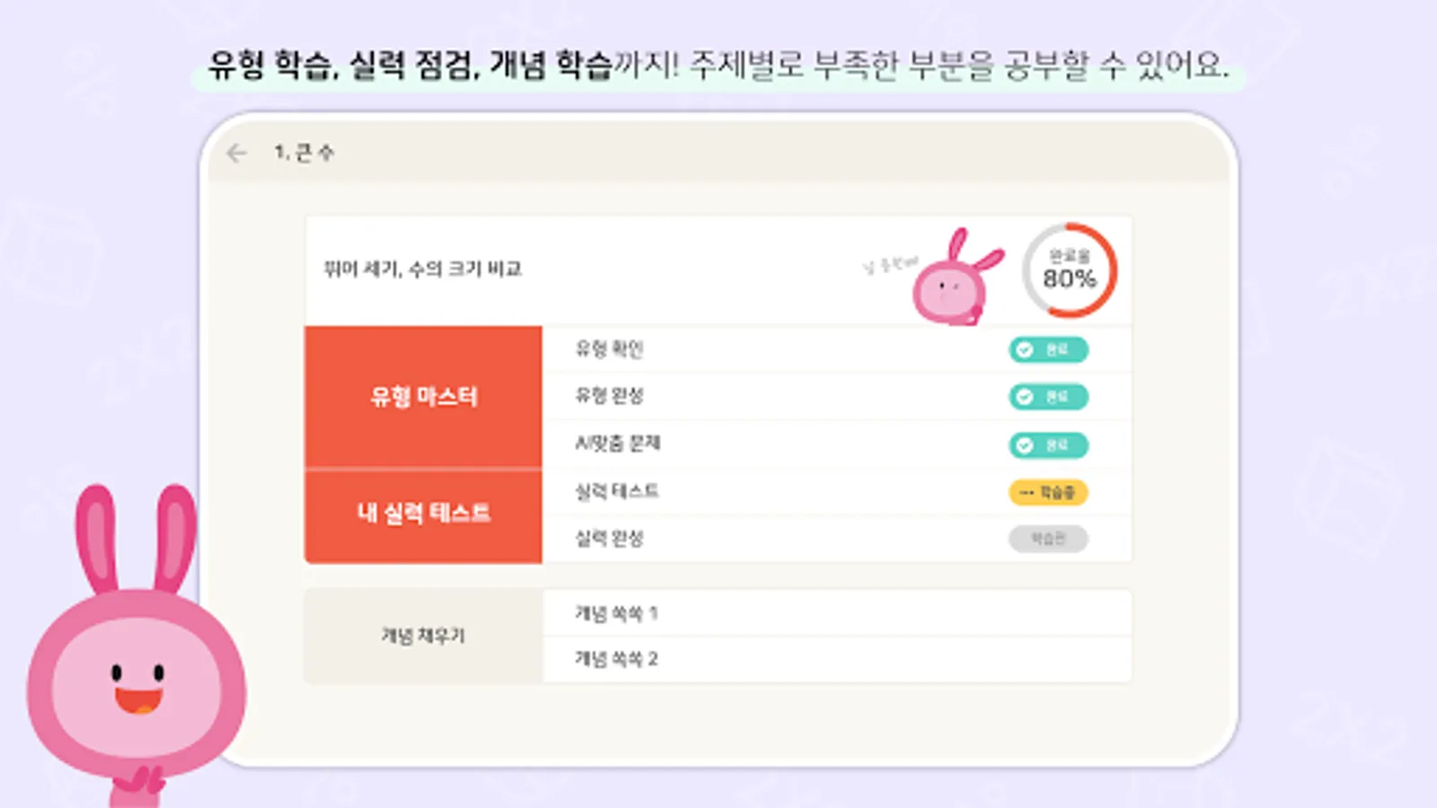 It consists of corners essential for learning by topic, from basics to advanced problems, achievement tests, and concept videos. It can be used even during vacation depending on the situation of our class.
