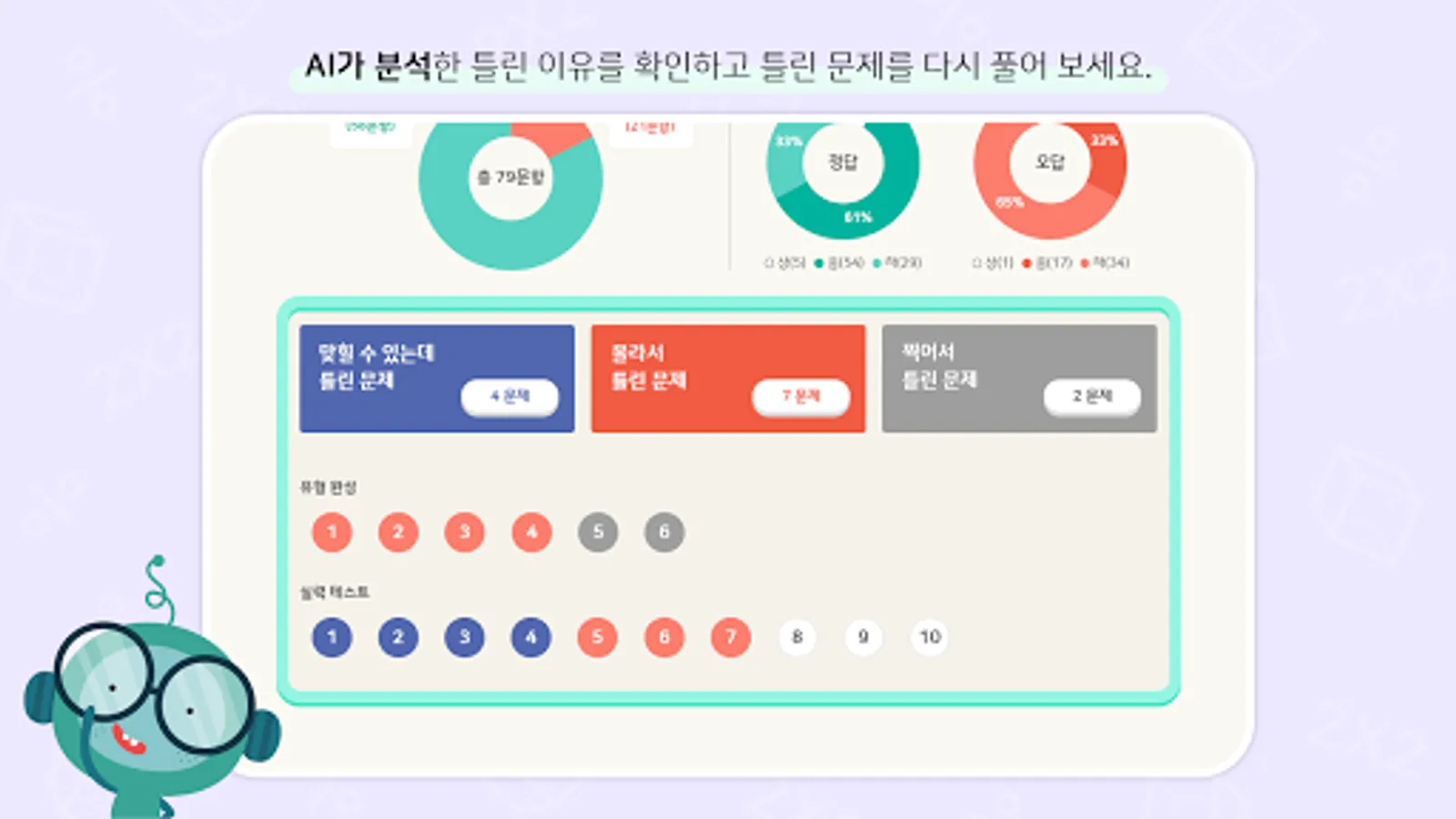 It provides a variety of functions and content for effective problem-solving learning. In particular, AI customized problems and twin problems with incorrect answers are provided customized for each child according to learning results.