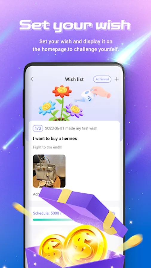 You can set your wish and display it on the homepage.Challenge yourself and see wether you can achieve it on the expected date.