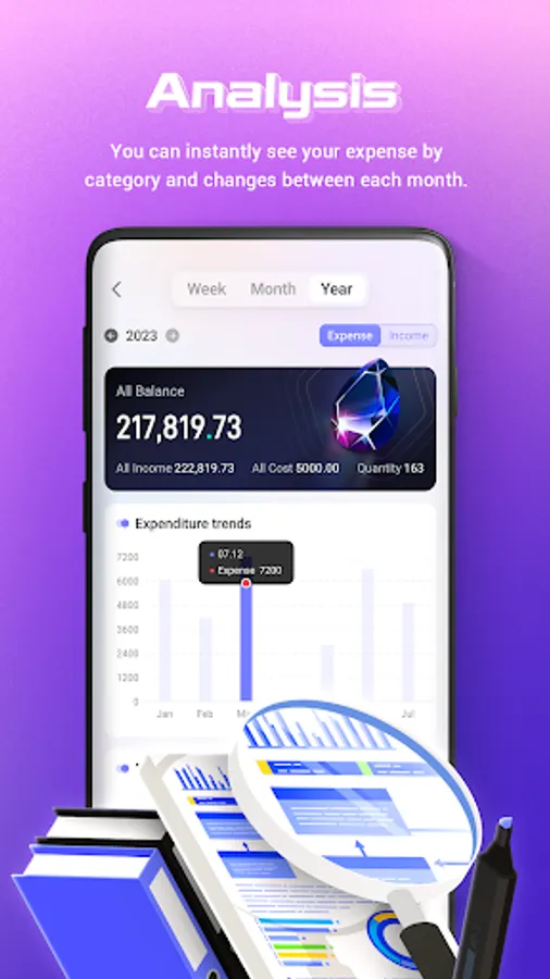 You can instantly see your expense by category and changes between each month. And you can see the change of your assets and income/expense indicated by a graph as well.