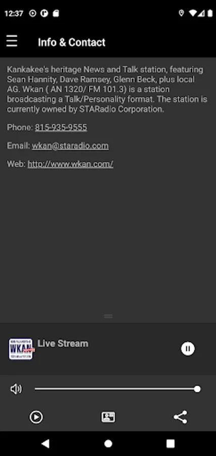Kankakee's heritage News and Talk station, featuring Sean Hannity, Dave Ramsey, Glenn Beck, plus local AG. WKAN ( AM 1320/ FM 101.3) is a station broadcasting a Talk/Personality format. The station is currently owned by STARadio Corporation.