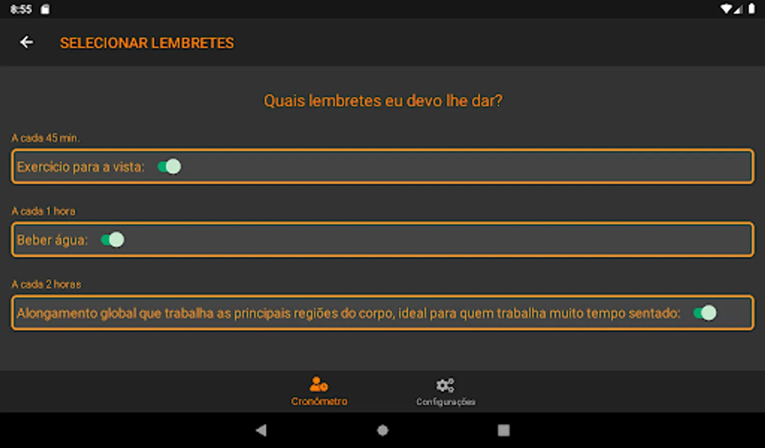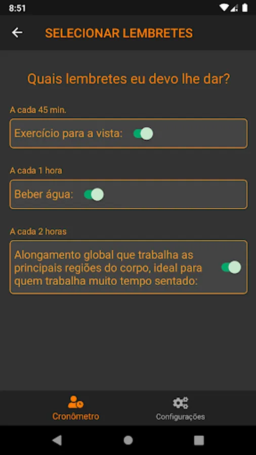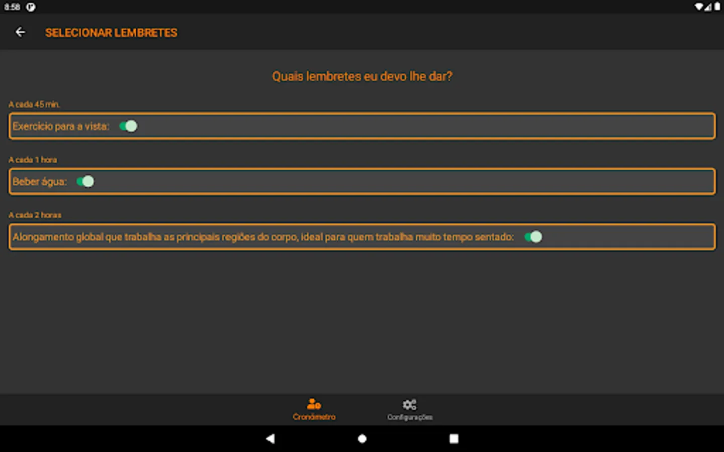 With reminders that are triggered from time to time, you can remember to set aside a few minutes of your day to pay attention to your health.