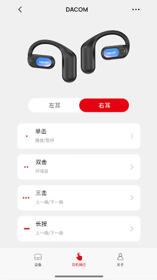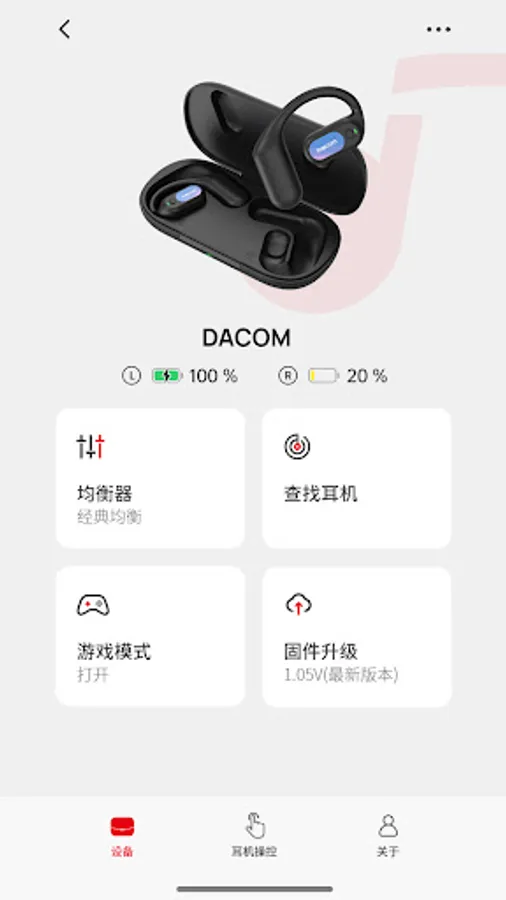 DACOM APP is used for setting headphones, such as button function setting, EQ setting, language setting, game mode, etc; It can also be used to upgrade the headset firmware.