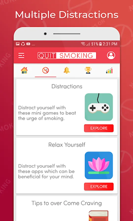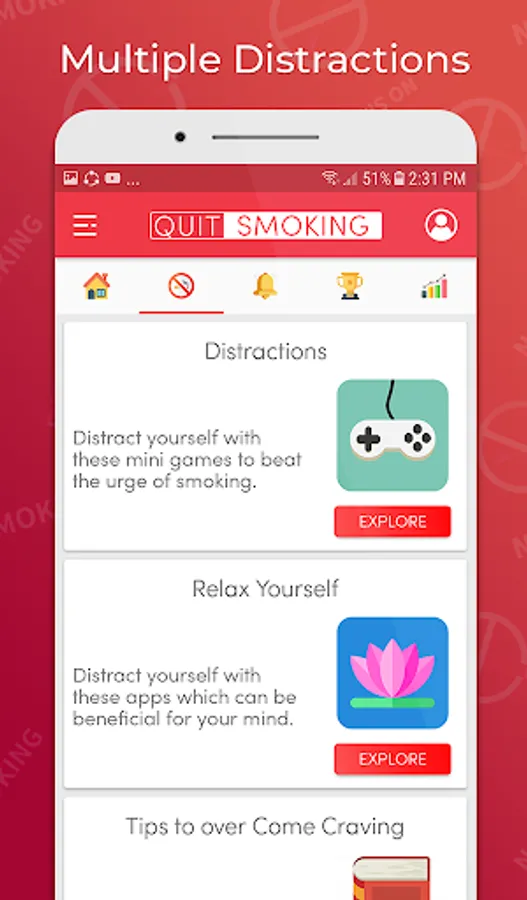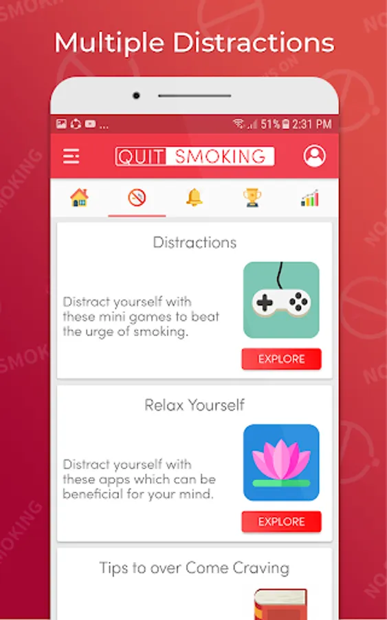Our Smoke Free model is simple; Smoke free: Stop, Quit, No smoking - Quit Tracker follows a simple premise that habits can only be replaced and tracking our habits makes us stronger than them. We focus primarily on establishing a connection with the user catering to all smoke cravings throughout the day. Smoke free: Stop, Quit, No smoking - Quit Tracker establishes a unique distraction mechanism that helps Quitting easy and manageable.