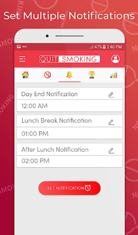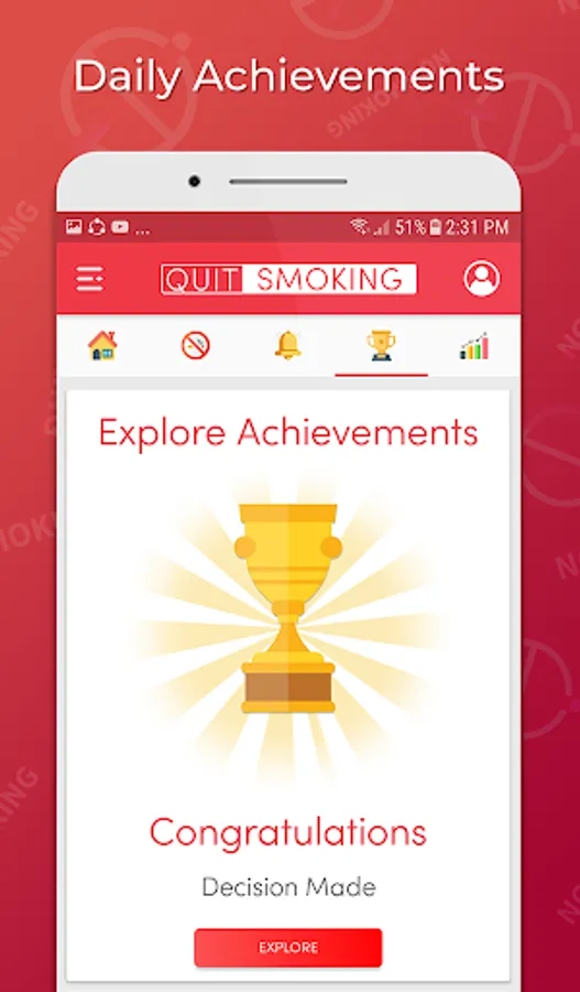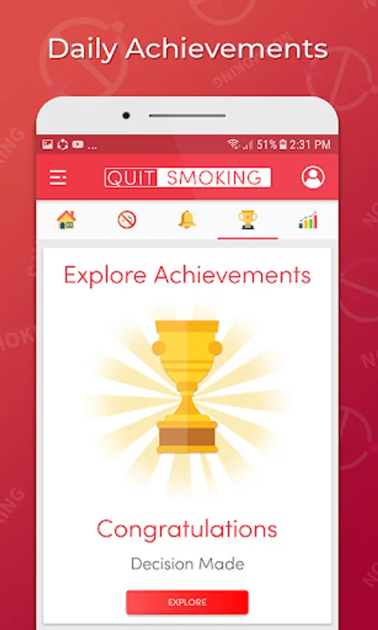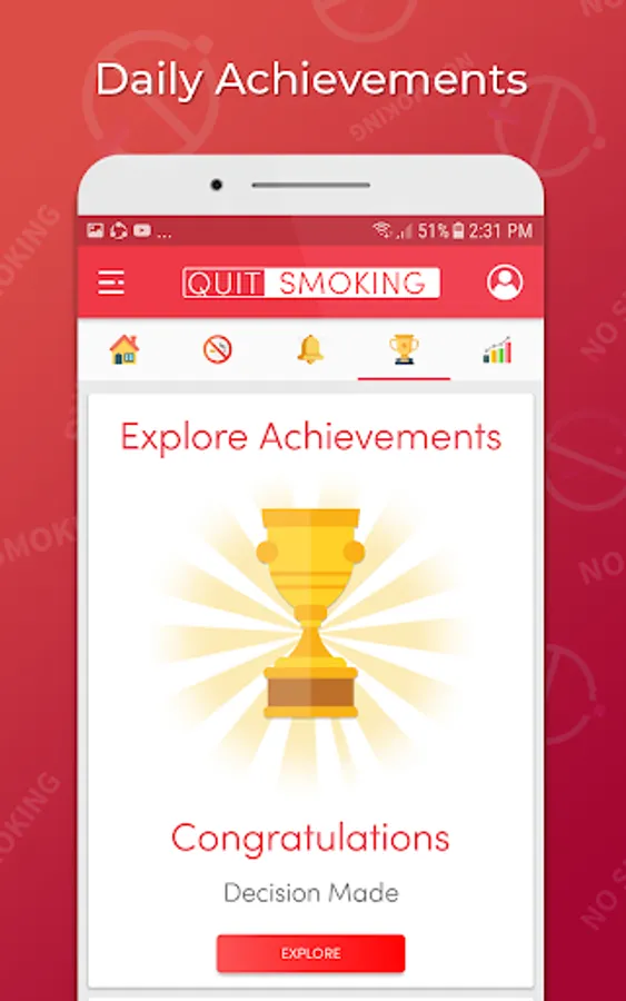 Smoke free: Stop, Quit, No smoking - Quit Tracker also offers daily motivation quotes which also helps to motivate your feelings and thoughts. Be smoke free daily and try not to smoke and you will be rewarded with different achievements and badges which will be unlocked over time.