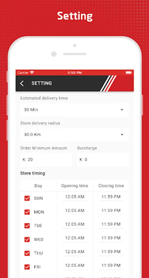 - Manage store details like store time, manage product status, packaging charge, delivery radius, minimum order amount, Estimated delivery time, and more