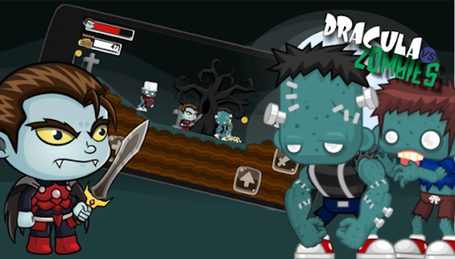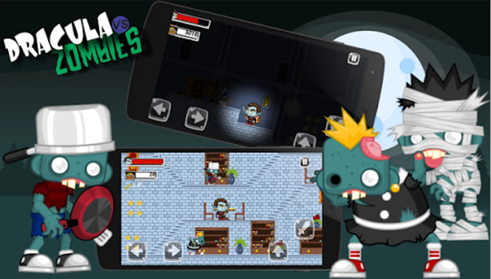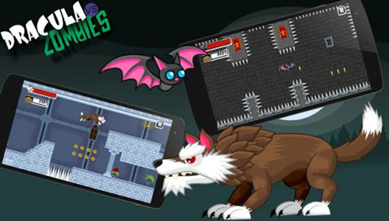 Help Vlad Dracula prevent the invasion of Zombies in his castle. Help fight the Zombies that entered your twilight castle. After a tremor in Transylvania, the Zombies rose and stormed the Old Vampire Count Dracula's castle, as well as scattered all their treasure around the four corners of Romania. The Zombies were able to enter their castle. Help Dracula recover all his treasure and fight the Zombies that come his way. Discover lost keys in stages to unlock the doors. Fly with a few taps on the screen like bat in obstacle stages. Run and jump like a Wolf in racing stages to retrieve the coins, but watch out for obstacles that come your way. Your goal is to overcome all difficulties and defeat all Zombies to save Twilight Castle and King Night's treasure.