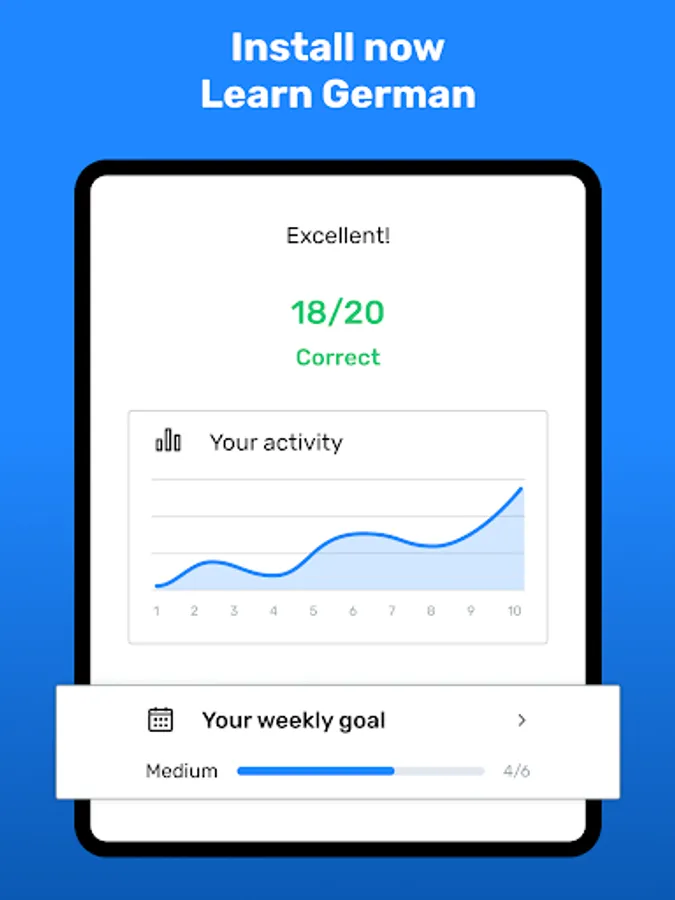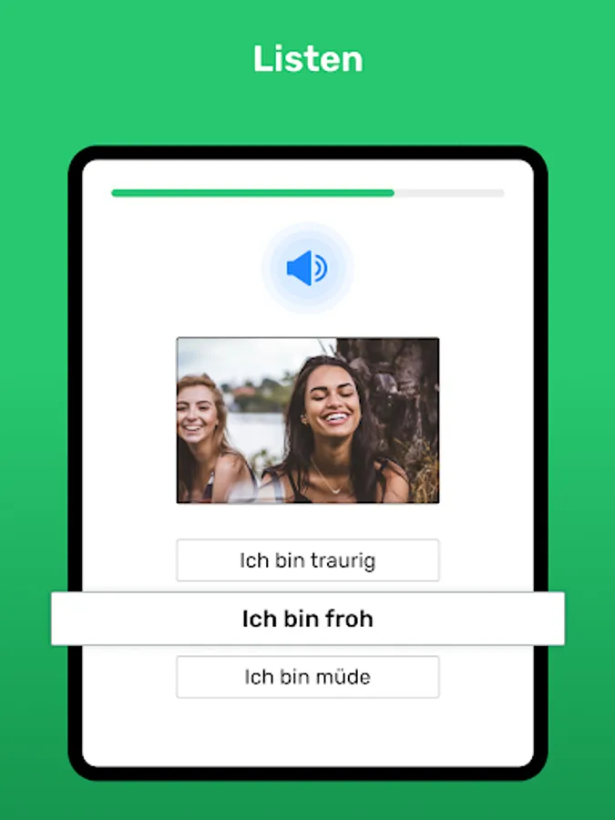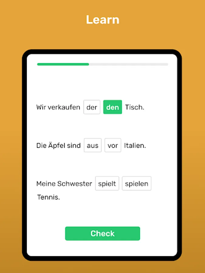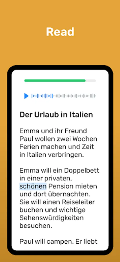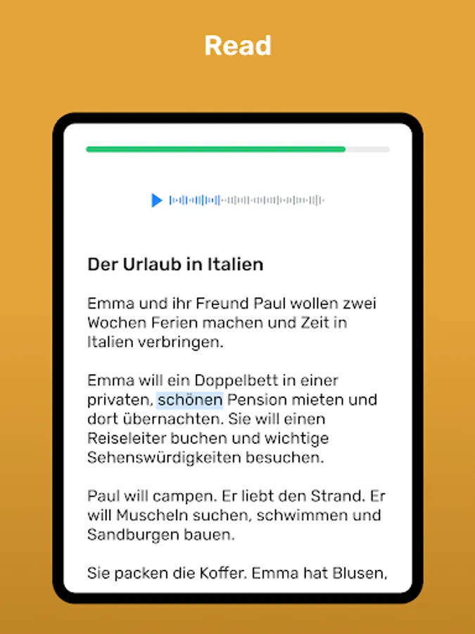 A learning process designed for you that is both easy and guided: You’ll feel like you’re learning more and more German every day. Every sentence, exercise, review, and reading has been carefully selected for you.