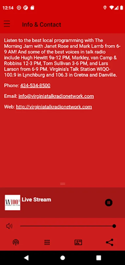 Listen to the best local programming with The Morning Jam with Janet Rose and Mark Lamb from 7-9 AM! And some of the best voices in talk radio include Hugh Hewit 9a-12 PM, Markley, van Camp & Robbins 12-3 PM, Tom Sullivan 3-6 PM, Lars Larson from 6-9 PM, and John Batchelor 9p-1a. Virginia's Talk Station WIQO- 100.9 in Lynchburg and 106.3 on the Southside