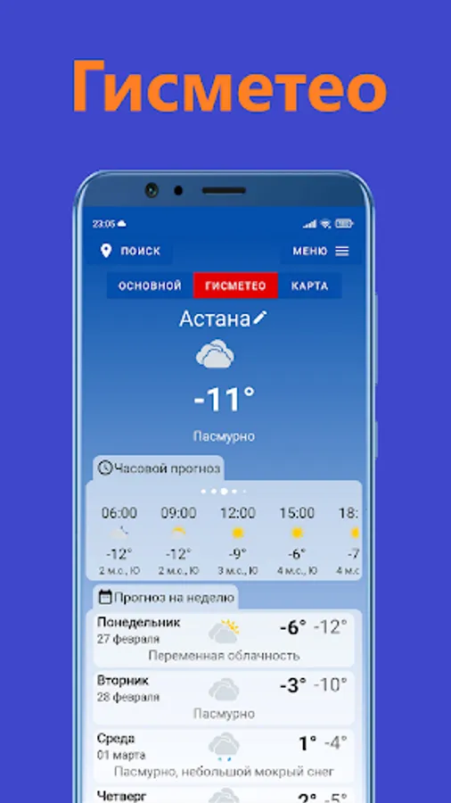 Switching between different settlements, track the weather conditions in other parts of the world. Using bookmarks allows you to quickly navigate from your current location to a selected location, and allows you to view accurate weather forecasts for today or tomorrow.
