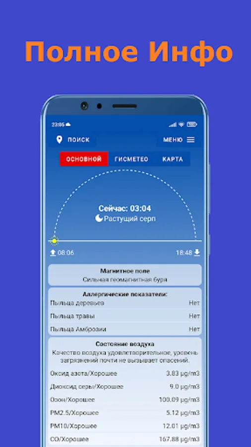 • Geomagnetic field activity and information for allergy sufferers. Get only up-to-date data to protect yourself and your loved ones. Allergy will not take you by surprise anymore, because all the necessary information about the causes, symptoms and prevention of the disease is collected in one application. Receive notifications on your smartphone if the situation outside the window is unfavorable for walking.