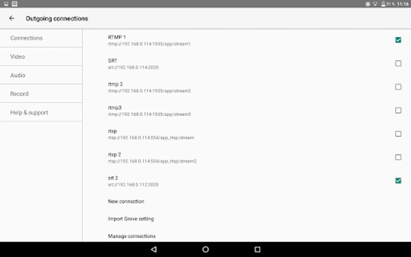 ~ Multiple simultaneous connections support - add several connections profiles and choose up to 3 connections for simultaneous streaming, E.g. stream to Nimble Streamer, YouTube and Twitch.