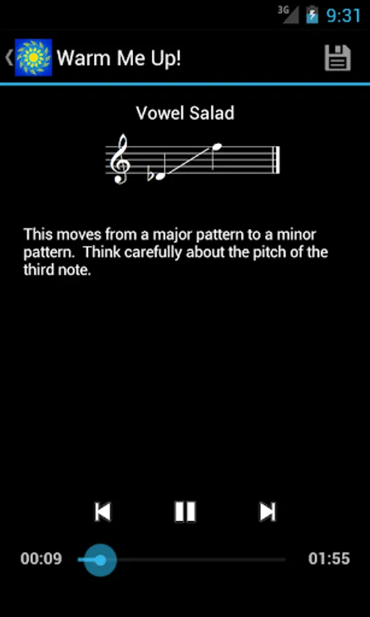 Warm Me Up! will create a unique warm up for you. It can generate a warm up based on how much time you have available or you can browse the individual tracks and create your own warm up as you desire. The exercises are recorded in high quality audio. A lush baby grand accompanies the singer through each exercise and a professional singer guides you through the first two repeats of each. On screen, each exercise is accompanied by suggestions and instructions to help you get the most out of each exercise.