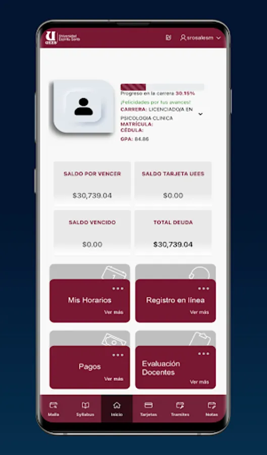 Aplicación móvil del sistema académico de la Universidad Espíritu Santos (UEES), que permite a los estudiantes visualizar de forma rápida: el perfil académico, los paralelos en los que se encuentra registrado, historial académico, calificaciones, deudas, pagos en línea y realizar el registro en línea.