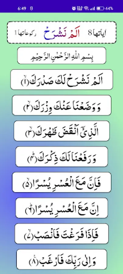 Surah Inshirah, also called al-Sharh (الشرح) and Alam Nashrah (الم نشرح) is the 94th surah of the noble Quran, in Juz' 30, with 8 verses and 27 words. It was revealed in Mecca in the early years of the appointment of Muhammad (S) as the messenger of God after sura Duha.