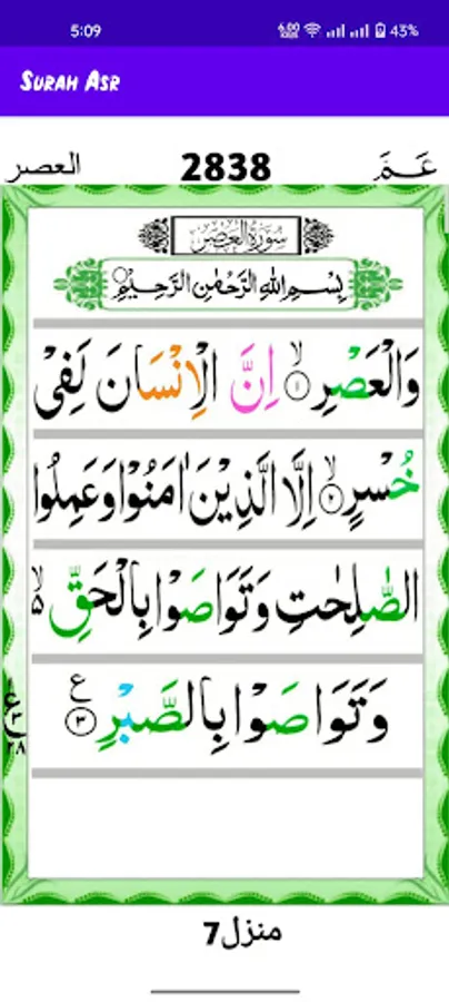 Al-Asr, (Arabic: العصر, The Declining Day, Eventide, The Epoch, Time") is the 103rd chapter (sūrah) of the Qur'ān, the Muslim holy book. It contains three āyāt or verses. Surat al-'Asr is the third shortest chapter after Al-Kawthar and Al-Nasr, being shorter than Al-Nasr by only two words in the 3rd verse.