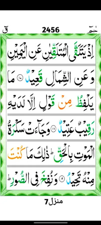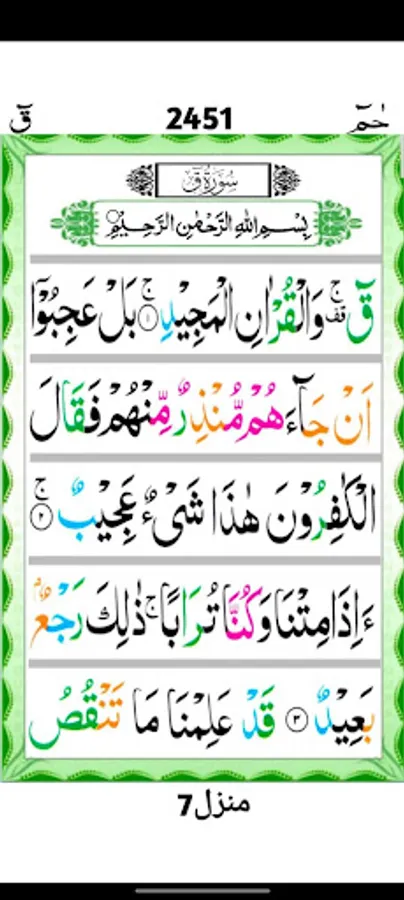 Qaf (Arabic: ق, the letter qāf), is the 50th chapter (sūrah) of the Qur'an with 45 verses (āyāt). The name is taken from the single discrete Quranic "mysterious letter" qāf that opens the chapter. It is the beginning of the Hizb al-Mufassal, the seventh and the last portion (manzil).
