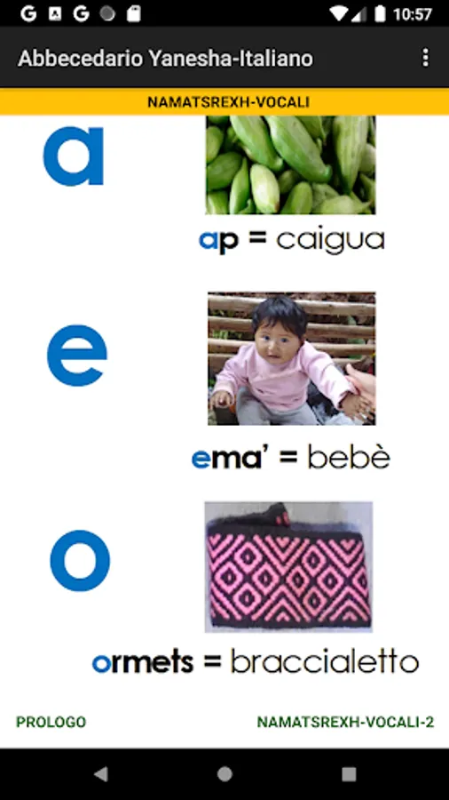 The interesting thing about this "Yanesha-Italian ABC" lies in its interactive and multimedia features, in fact by touching the images or the title of the page you can hear the words pronounced in Yanesha and Italian, this facilitates teaching in the classroom and also allows a child to learn yanesha language independently.