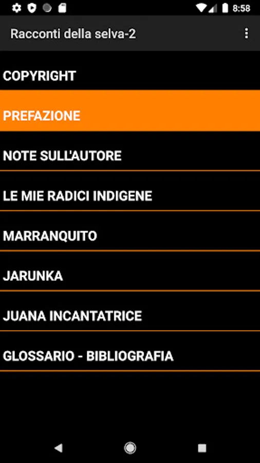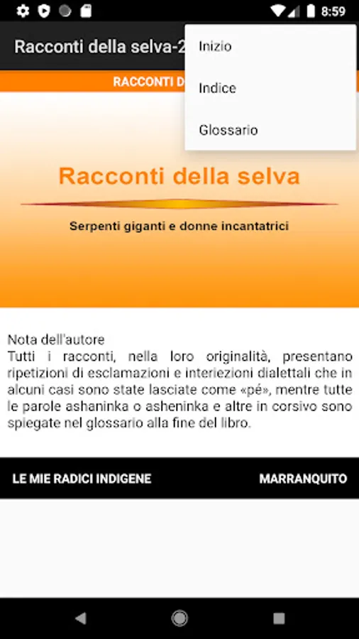 Once the application is installed, the splash screen will appear from which with a simple touch you can go directly to the interactive index of the book. At the bottom of the pages there are two text buttons to go to the previous chapter, while from the menu you can go back to the beginning or to the index.