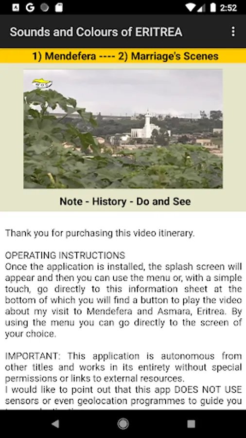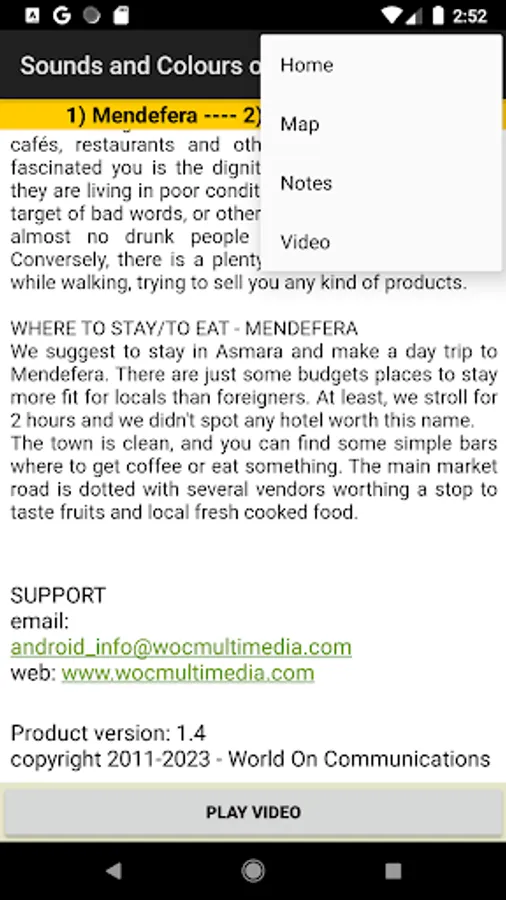 Start the app, after the splash screen you are presented with the information sheet which scrolled to the end reveals a button to play the videoclip. Map and other options are available via the menu button. Since 1990, World On Communications has realized more than 80 videoguides about several suggestive places around the world. Every videoguide has been conceived how an itinerary that people can easily retrace. Now, these videoguides and their information are used to compile this new serial of android apps.