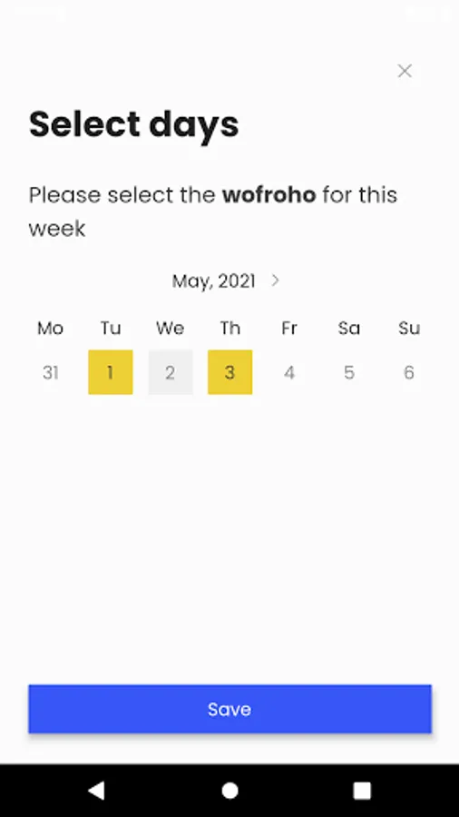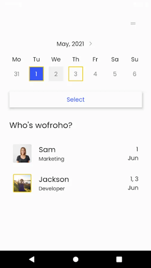 An app for employees to show when they work from home. A user can set days for each week that they are working from home. Other employees within the organisation can see the employees who are working from home by selecting each day.