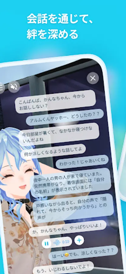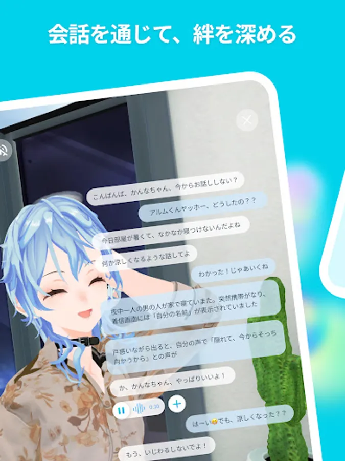自然な会話を通じて、AIキャラがあなたを記憶、理解し、二人だけの関係を築くことができます。対話を重ねることで、気の通じた友人になってもらうこともできますし、叱咤激励してくれるメンターになってもらうこともできます。恋人同士のようなドキドキする会話体験を楽しむこともできます。