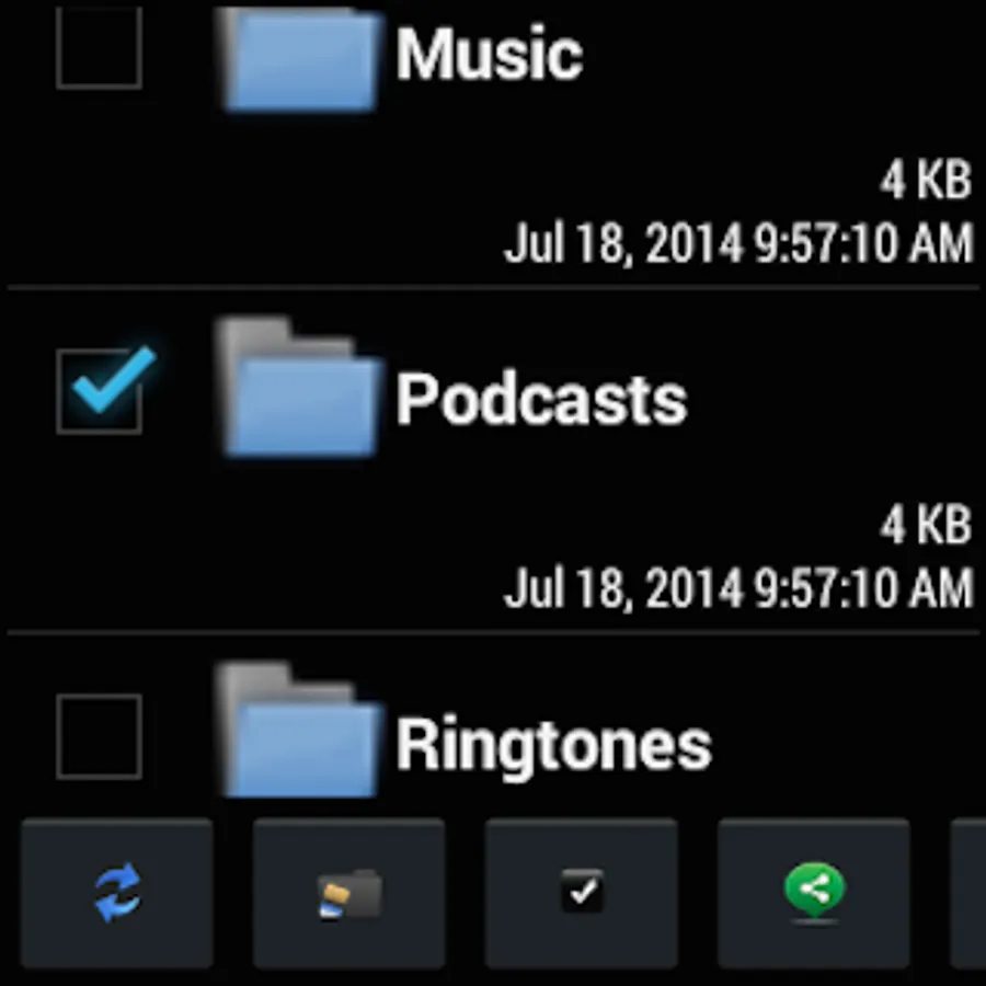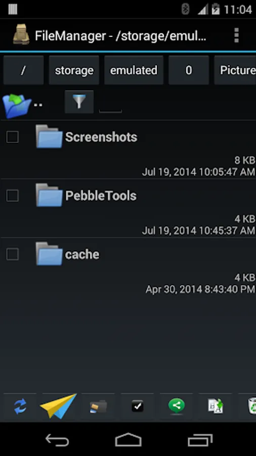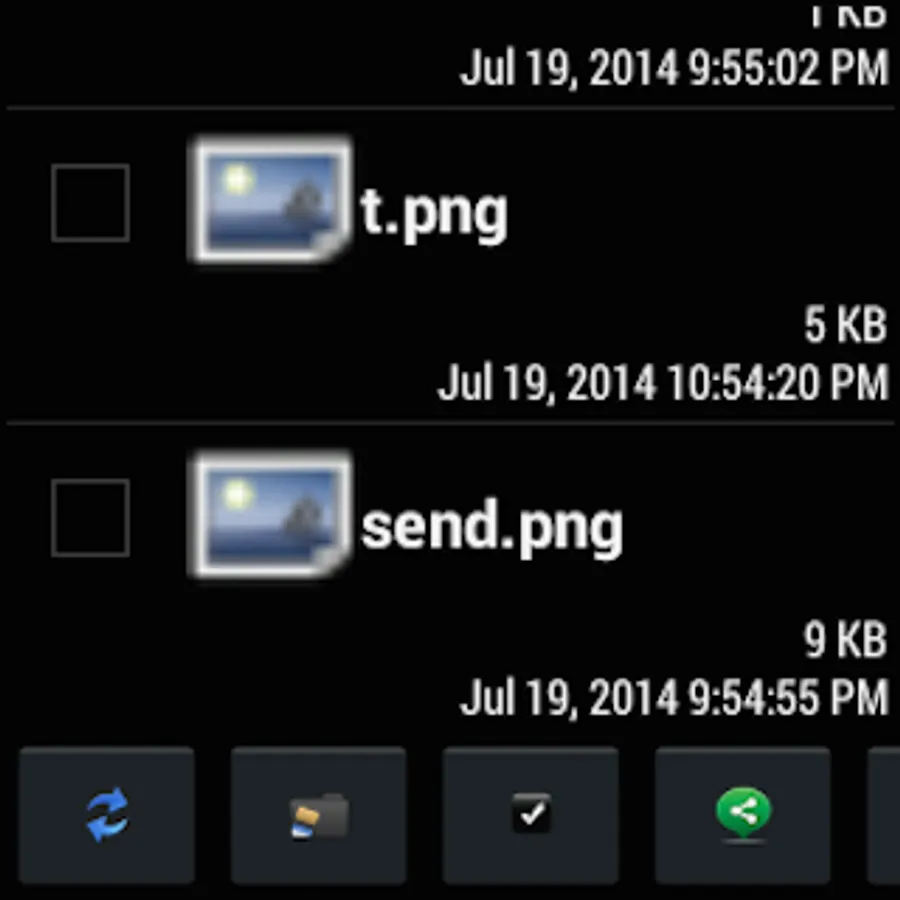 The icon from left to right means: Refresh, Send file, go to SD Card folder, Select All, Share files, Rename file, Delete File, Order by Name, Order by length, New Folder, copy file, cut , paste, cancel.