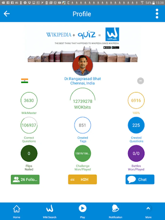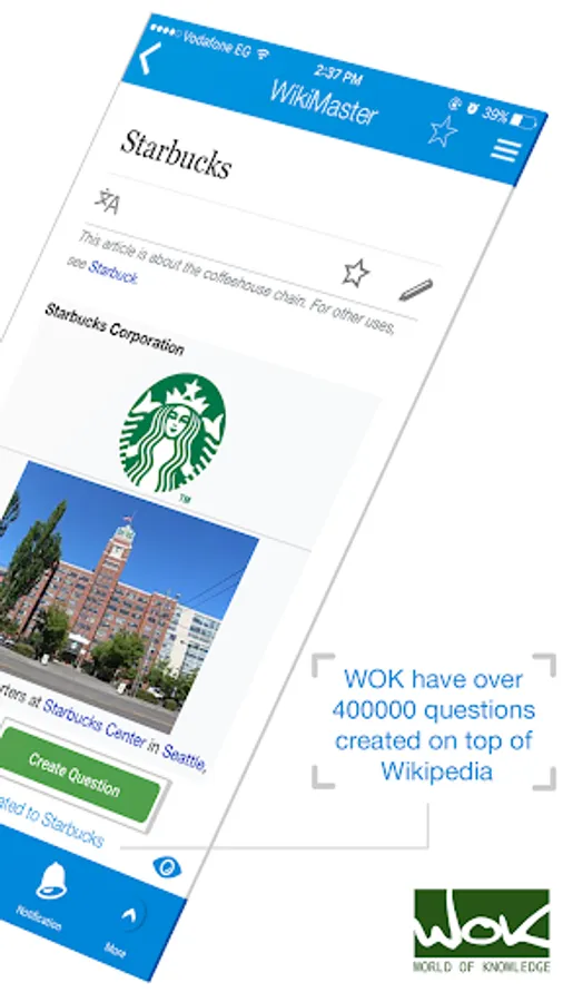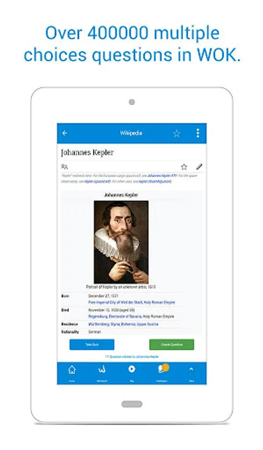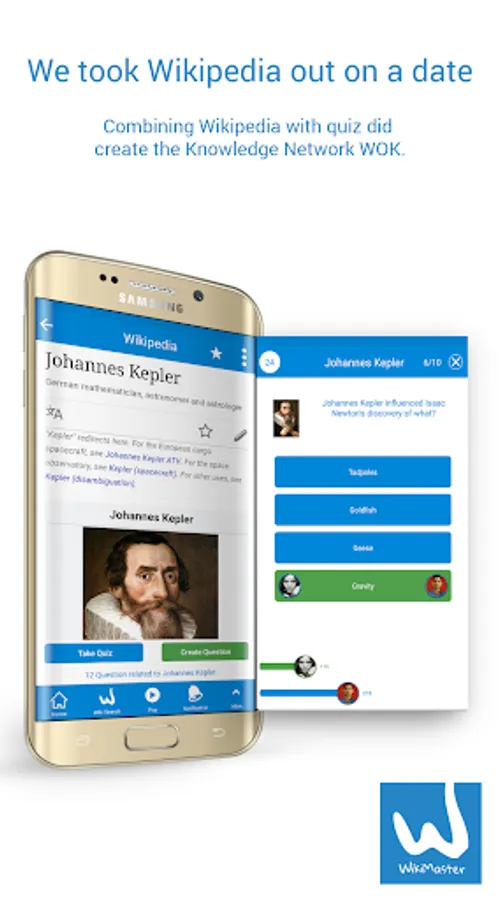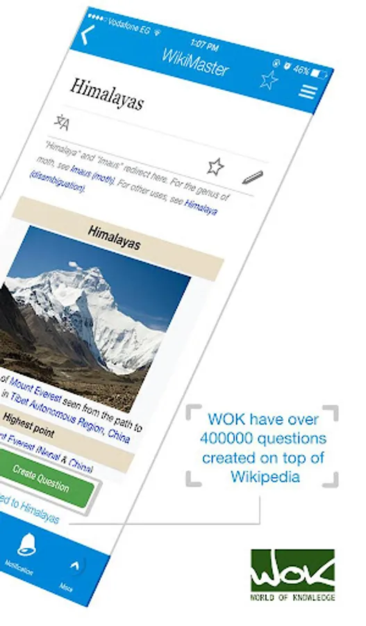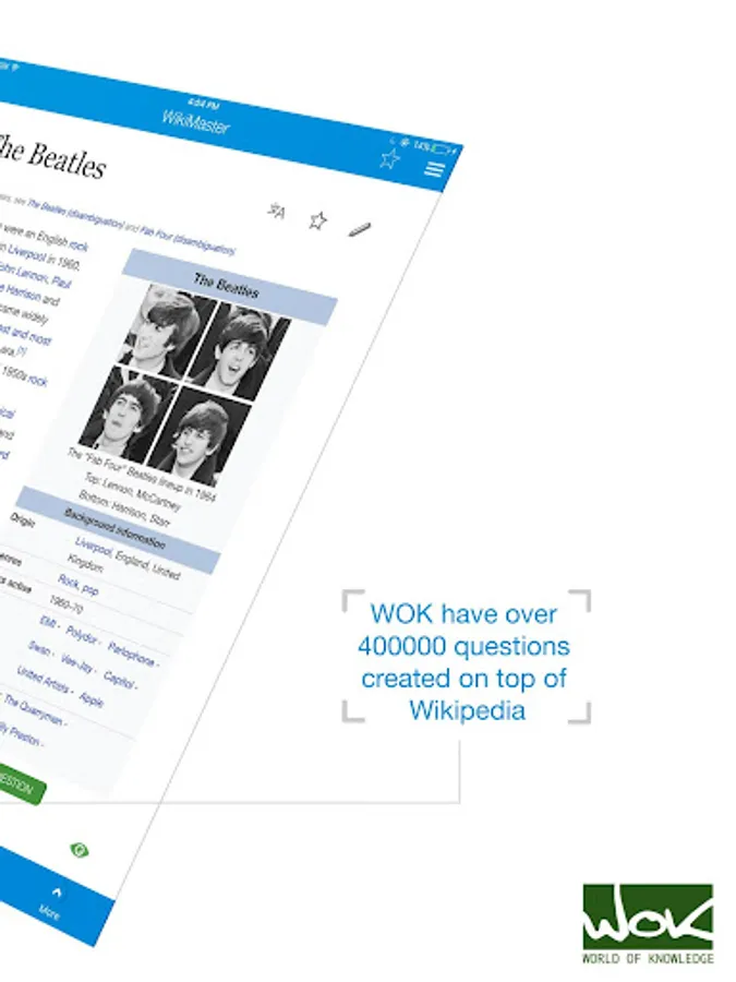 WOK is the Knowledge Network with WikiMaster as the main app in combining all the fun in learning from Wikipedia and then play quiz trivia games while also being a social network for knowledge. WOK is a community for knowledge where the WOKers create good and interesting questions in the Wikipedia articles for other WOKers to take. In any Wikipedia article.