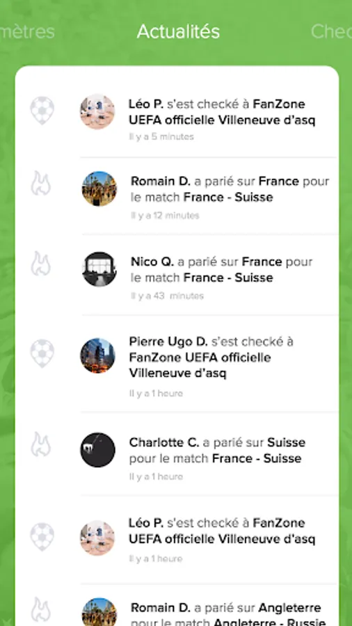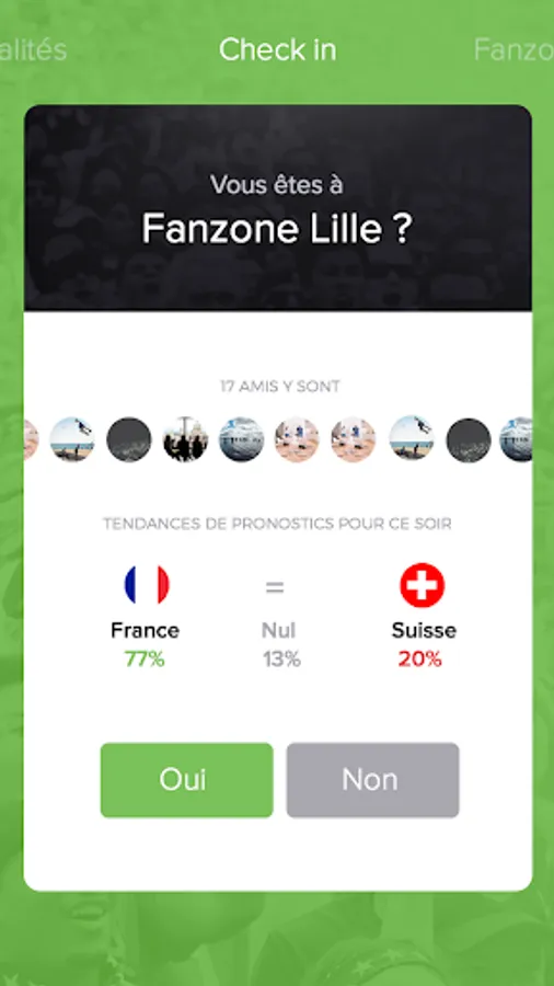 Fanzone Community lets you notify your friends of your presence within a Fanzone and invite them to join you. Once there, predict the matches of the day and see the votes trends throughout France!