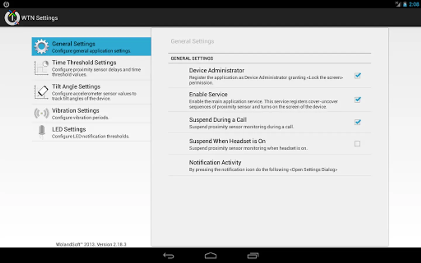 IMPORTANT! You must deactivate Device Administration before uninstalling the app, otherwise you will not be able to uninstall it. You can do that directly from the application settings dialog (go to WTN Settings >> General Settings and uncheck the "Device Administrator" check-box) or you can do it directly from Settings dialog of your device (go to Settings >> Security >> Device administrators and uncheck the "Turn Off the Screen")