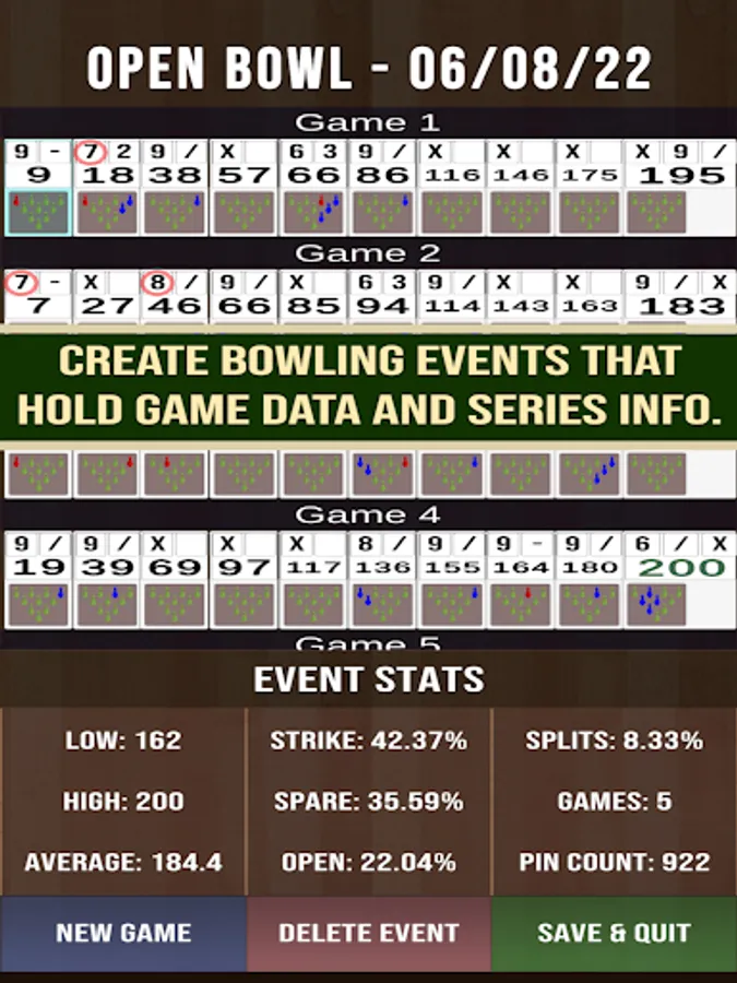 -View your scoresheet for the event you're bowling. This includes, high/low games, strike, spare, and open percentages, pin count, averages and more!