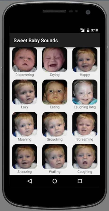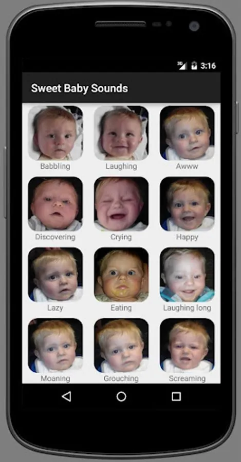 Sounds: This app contains a accomplished combination of different baby sounds like laughing, crying, moaning, wailing sneezing, eating, screaming and many more.