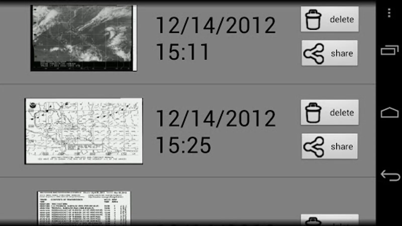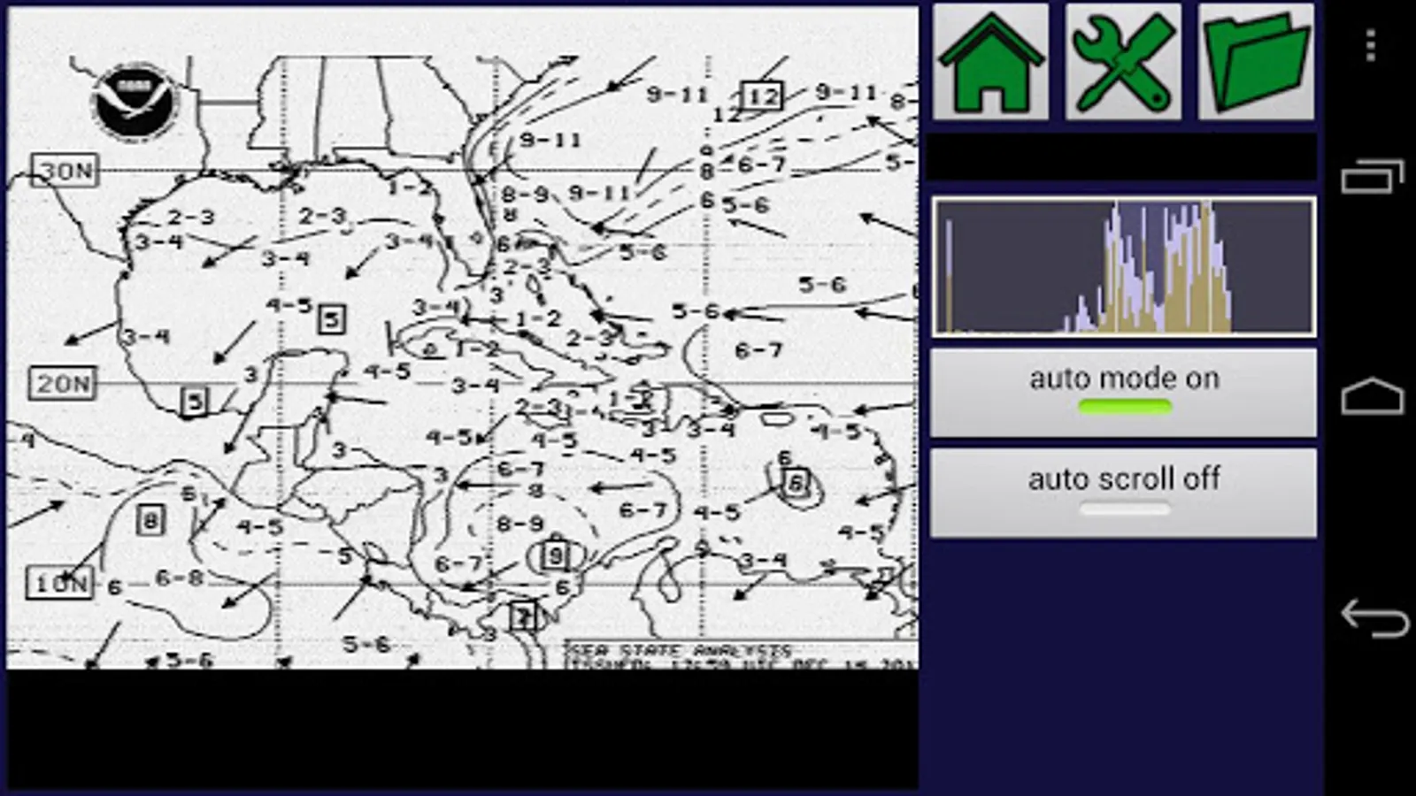 HF Weather Fax for Android decodes weather fax 120/576 charts and satellite images through the microphone of your Android phone or tablet. Just hold your phone or tablet close to the speaker of your marine radio, sideband receiver or Ham Radio transceiver and start decoding weather fax images in minutes.