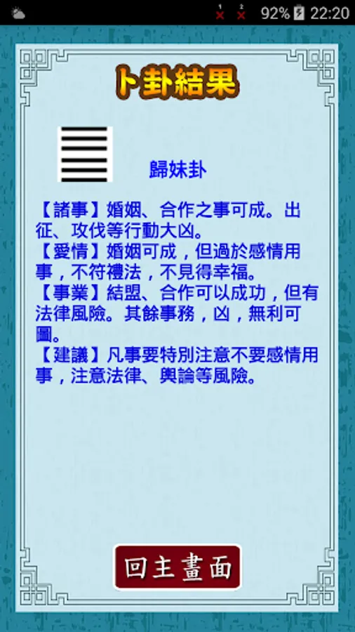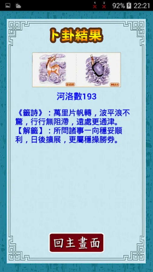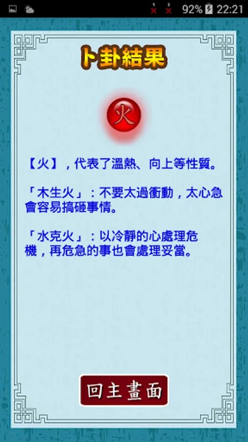 This fortune-telling program uses the 64 hexagrams of I Ching, the five elements (gold, wood, water, fire, earth), and the Heluo map to derive mathematical fortune-telling.