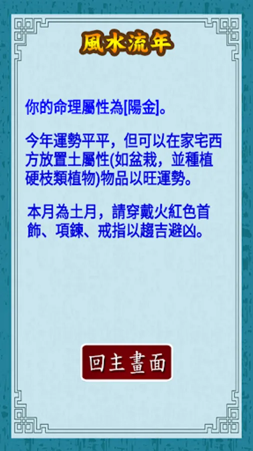 In addition, the fleeting year is judged based on the user's birthday, and the five elements are used to regenerate and restrain each other.