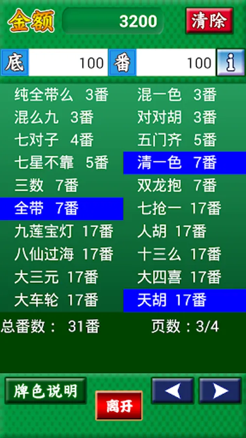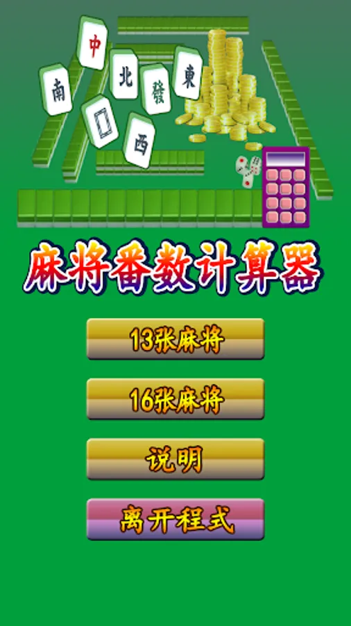 麻将有分为十三张麻将和十六张麻将,除张数不同,玩法大同小异,而胡牌之牌色也大部份相同,但还是有些独特的牌色,如十三么、七对子、一条龙、五暗刻...等,不同的牌色有不同的台数,让人很难全记住,本程式不只列出所有胡牌牌色,另外还计算出所赢金额,另外也可修改台数,最重要的一点还有牌色说明,简直也可算是麻将字典。