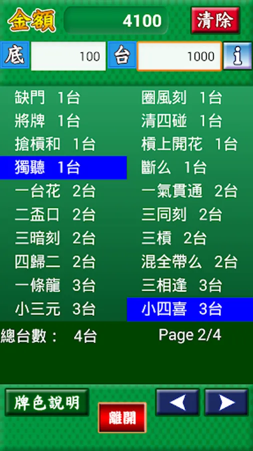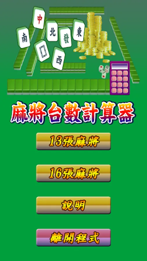 麻將有分為十三張麻將和十六張麻將,除張數不同,玩法大同小異,而胡牌之牌色也大部份相同,但還是有些獨特的牌色,如十三么、七對子、一條龍、五暗刻...等,不同的牌色有不同的台數,讓人很難全記住,本程式不只列出所有胡牌牌色,另外還計算出所贏金額,另外也可修改台數,最重要的一點還有牌色說明,簡直也可算是麻將字典。