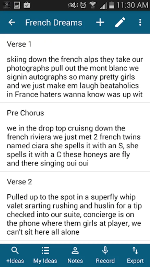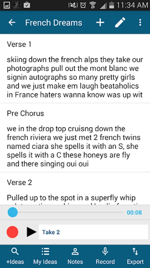 Got an idea for a melody? Tap 'Record' on the built in Audio Player and let it rip. Capture vocal ideas anytime inspiration strikes and save it with your lyric.
