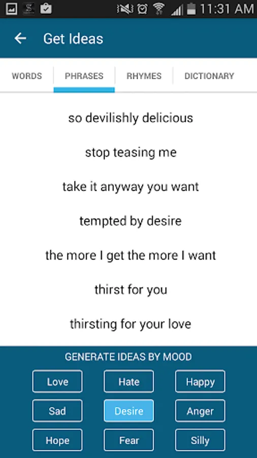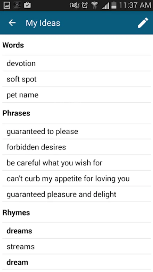 Can't find the right word or phrase? Running low on inspiration? Then Songwriter's Pad™ for Android is the app for you. It is the ultimate songwriting app. It contains powerful idea generating tools that are designed to inspire creative expression and eliminate writer's block. Lyric writing will never be the same.