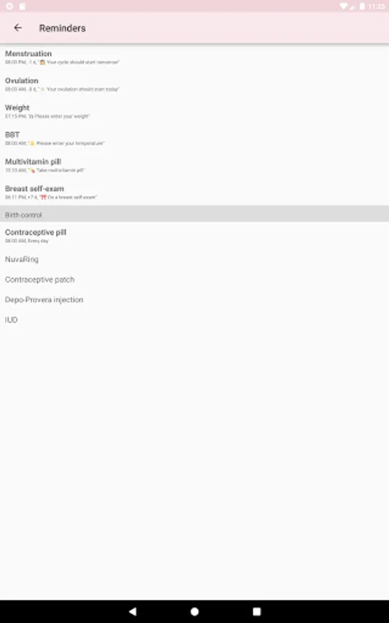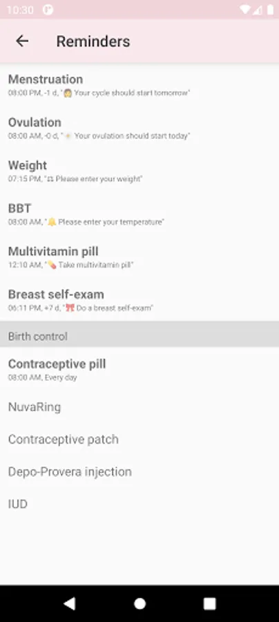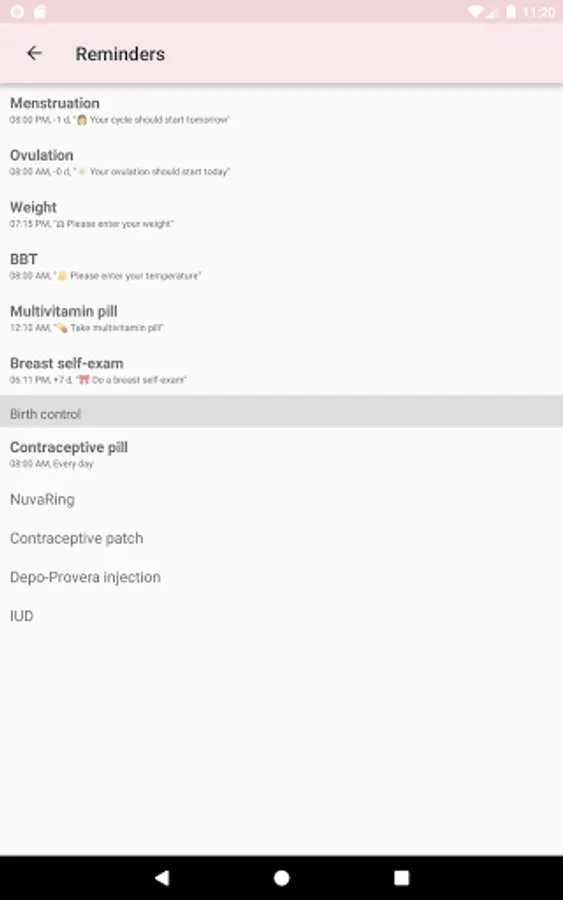 * Various daily reminders: Menstruation, Ovulation, Weight, BBT, Multivitamin pill, Breast self-exam, Contraceptive pill, Vaginal ring, Contraceptive patch, Contraceptive injection, IUD.