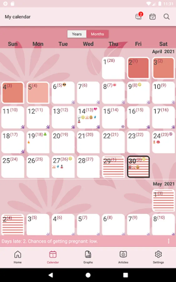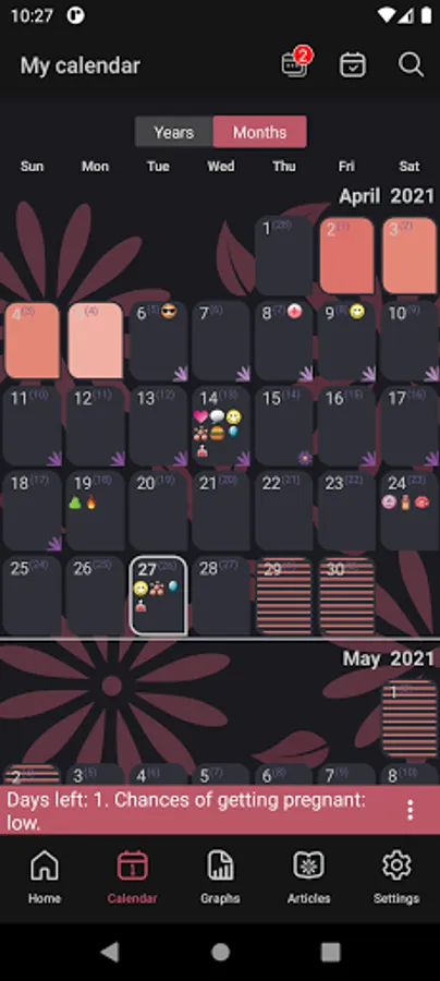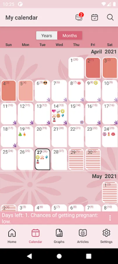 * You will see the probability percentage of your fertile days. This will allow you plan much better or to prevent pregnancy.