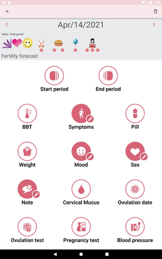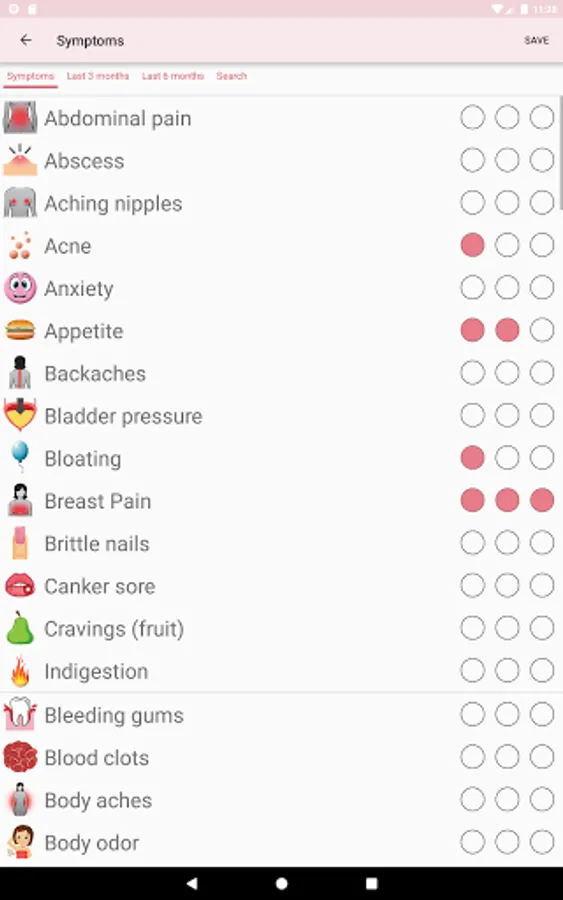 * Over 100 symptoms, other options like weight, BBT, moods, pills, sex life, cervical mucus, graphs and much more.