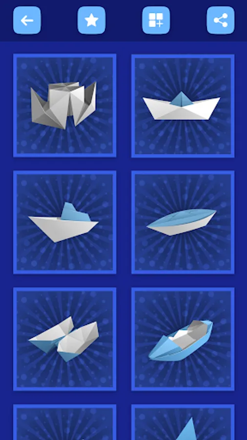 Have you ever wanted to know how to make a paper boat and launch it into a river or stream? Perhaps you will like this application, because here various origami schemes of paper ships and boats are collected: from classic to unusual models. This opens up many opportunities for games. For example, you can arrange competitions with the participation of origami ships.