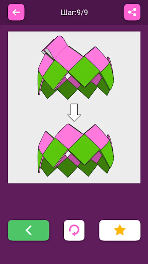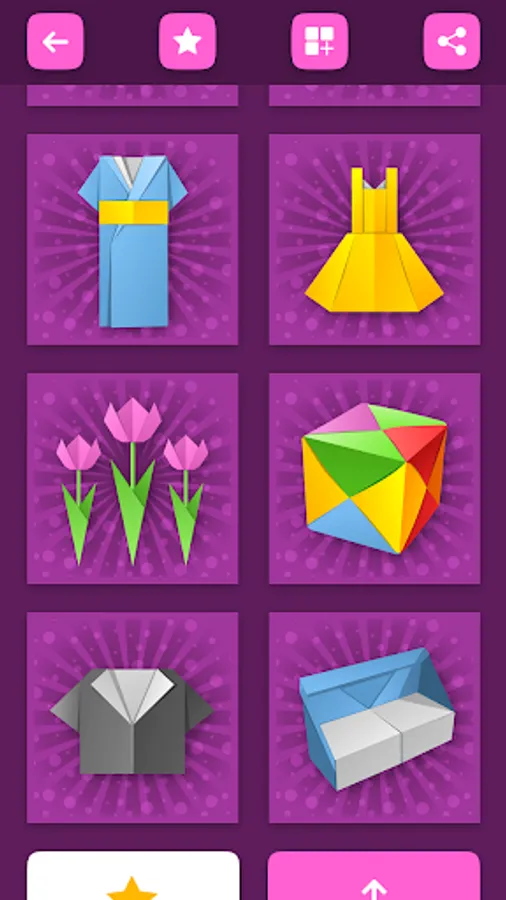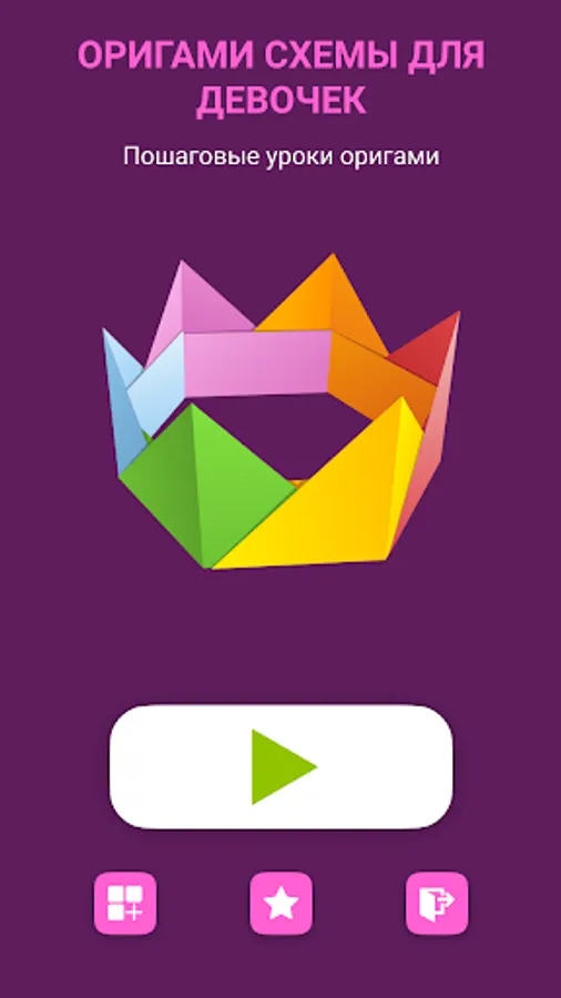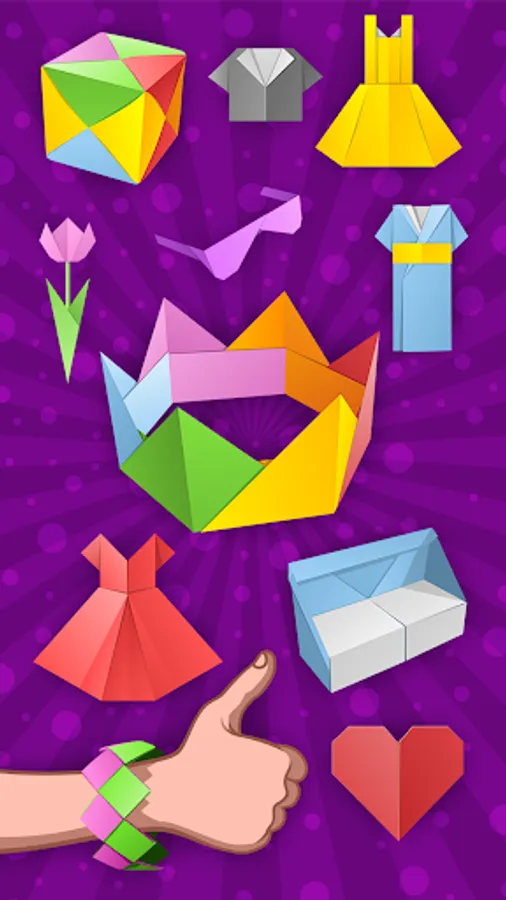 First of all, this application with step-by-step origami lessons will be interesting for girls and women. The fact is that here are collected schemes with different female things from paper, which can be used both for playing as toys and for decorating crafts or the interior as decorative elements. This application presents schemes of origami dresses, crown, color cube, origami paper bracelet, sofa and other schemes of different things from paper.